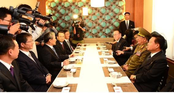 김관진 청와대 국가안보실장과 홍용표 통일부 장관은 지난 23일 오후 3시30분부터 판문점 평화의집에서 북한 황병서 조선인민군 총정치국장과 김양건 조선노동당 비서를 만나 협상을 재개했다.