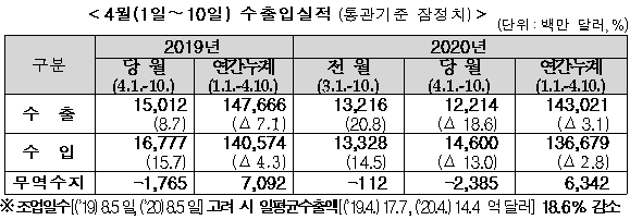 관세청은 4월 1~10일 기간 수출이 122억 달러로 작년 같은 기간보다 18.6%(28억 달러↓) 줄었다고 13일 밝혔다.