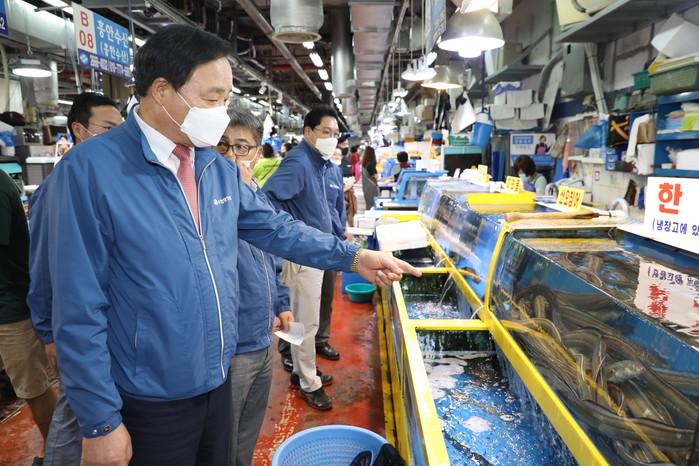 임 회장은 지난 6일부터 11월 15일까지 진행되는 제철수산물 할인행사 ‘대한민국 찐 수산대전’을 맞아 최근 소비 부진으로 어려움을 겪고 있는 수산물 소비 촉진을 위해 공판장에서 바다장어를 직접 구입했다.