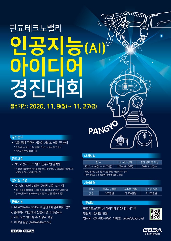 [로컬세계 고기훈 기자]경기도와 경기도경제과학진흥원이 오는 27일까지 ‘판교테크노밸리 인공지능(AI) 아이디어 경진대회’ 참가자를 모집한다고 11일 밝혔다.