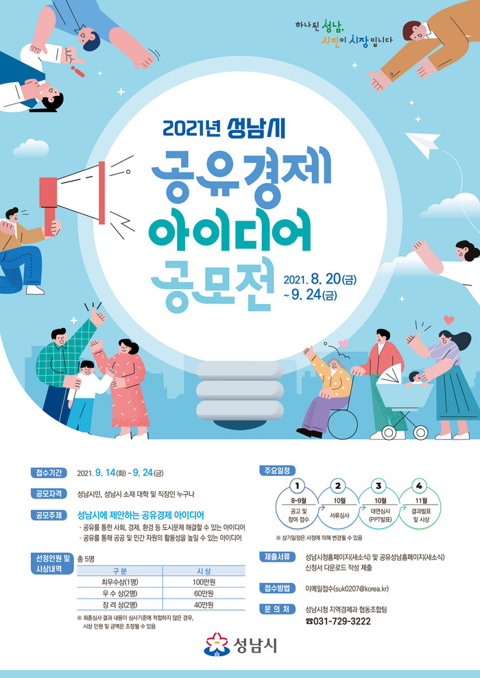 공모 주제는 공유를 통한 성남지역의 사회, 경제, 환경 등 도시문제 해결방안, 공공과 민간 자원의 활용성을 높이는 공유 활성화 방안 등이다.