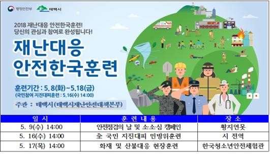 먼저 오는 5월 9일에는 어린이집 화재대피훈련과 안전점검의 날 소소심(소화기, 소화전, 심폐소생술)캠페인을, 5월 11일에는 태백 이마트에서 다중이용시설 화재대피훈련을, 5월 16일에는 전 국민 지진대피 민방위훈련을 실시할 예정이다.