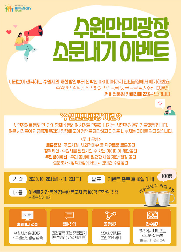 오는 26일부터 11월 20일까지 수원시민 누구나 참여할 수 있다. 이벤트 응모자 중 100명을 무작위로 추첨해 모바일 커피 상품권(1만원 상당)을 증정한다. 11월 30일 당첨자를 발표한다.