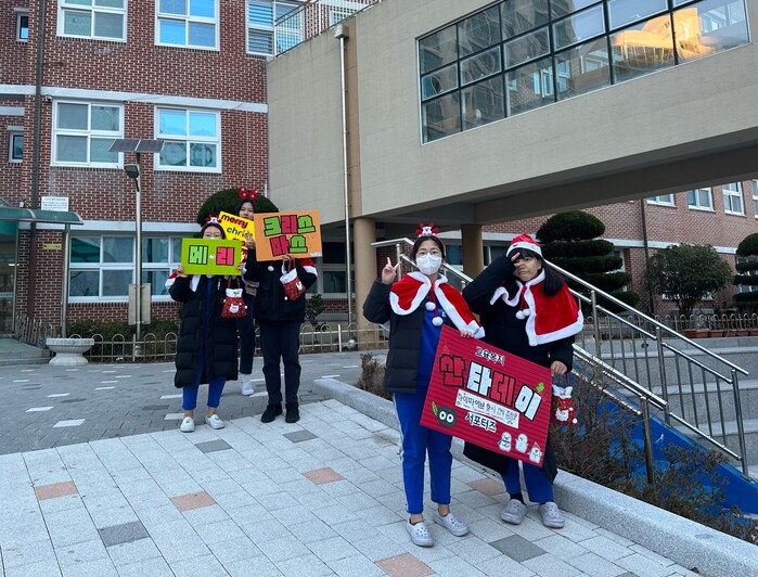 이날 ‘신곡중 산타’들은 직접 제작한 다양한 피켓을 들고 등교하는 학생들과 눈을 맞추고 하이파이브를 하며 간식을 전달했다.