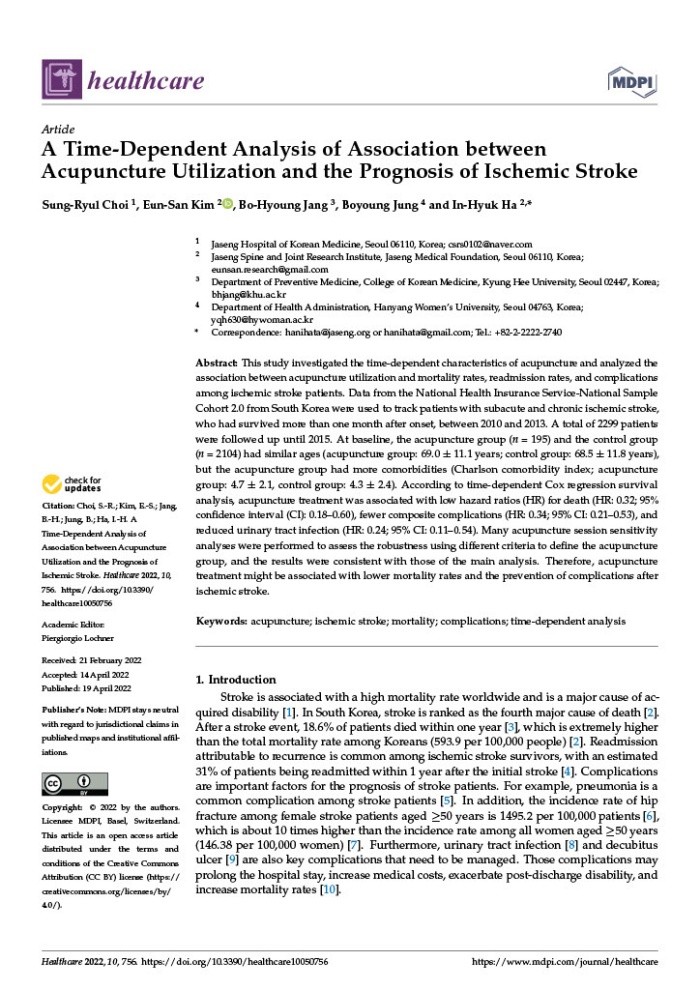▲‘Healthcare’ 4월호에 게재된 해당 연구 논문「A Time-Dependent Analysis of Association between Acupuncture Utilization and the Prognosis of Ischemic Stroke」 |