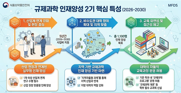 또한 비수도권 참여 확대를 위해 ‘지역자율형 과제’를 도입하고, 기존 학과 내 전공과정 형태의 규제과학 프로그램 운영을 허용하는 등 참여 문턱을 낮췄다. 학부 과정에는 ‘규제과학 개론’ 등 기초 교과목도 포함해 저변 확대를 유도할 방침이다.