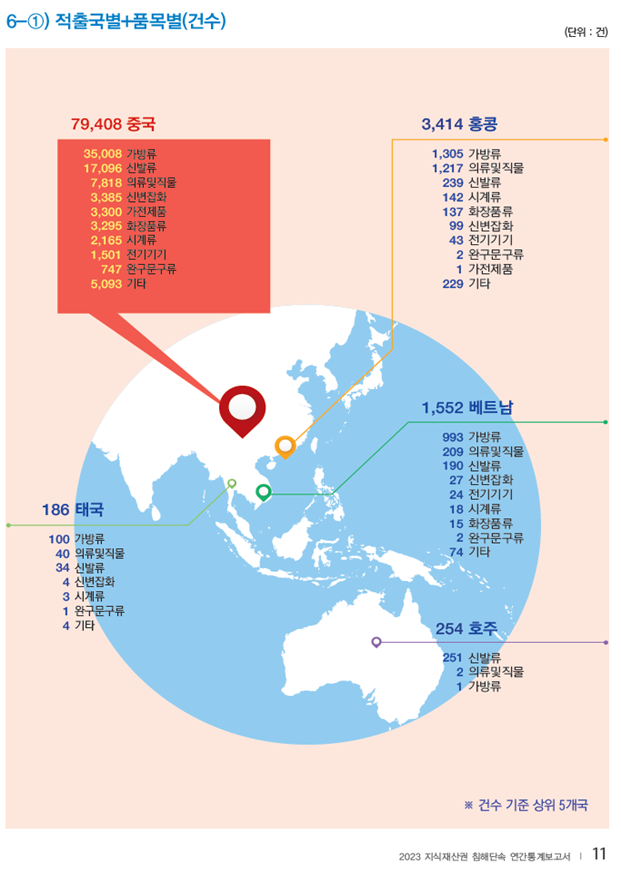 적발된 품목은 가방류 3만7574건(44.1%), 신발류 1만7847건(20.9%), 의류 9332건(10.9%), 가전제품 4986건(5.8%) 등의 순이었으며, 가전제품이 2021년 393건, 2022년 1777건에 비해 크게 증가한 점이 눈에 띄었다.