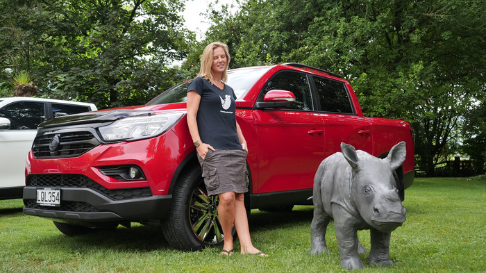 ▲무쏘 브랜드 홍보대사인 뉴질랜드 동물보호단체 세이빙 더 와일드 설립자이자 코뿔소 환경운동가 제이미 조셉이 전시된 무쏘에서 포즈를 취하고 있다. |