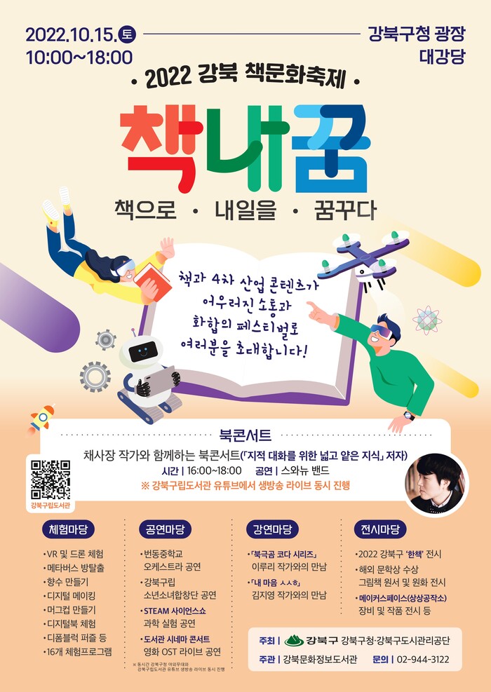 올해로 10회를 맞이하는 ‘2022 강북 책문화축제’는 15일 10시부터 오후 6시까지 강북구청 광장과 4층 대강당에서 진행된다. 코로나로 인해 3년 만에 대면으로 전환되어 운영하는 이번 행사는 책과 4차 산업 콘텐츠가 어우러진 소통·화합의 페스티벌로 대중의 기대감을 높이고 있다.