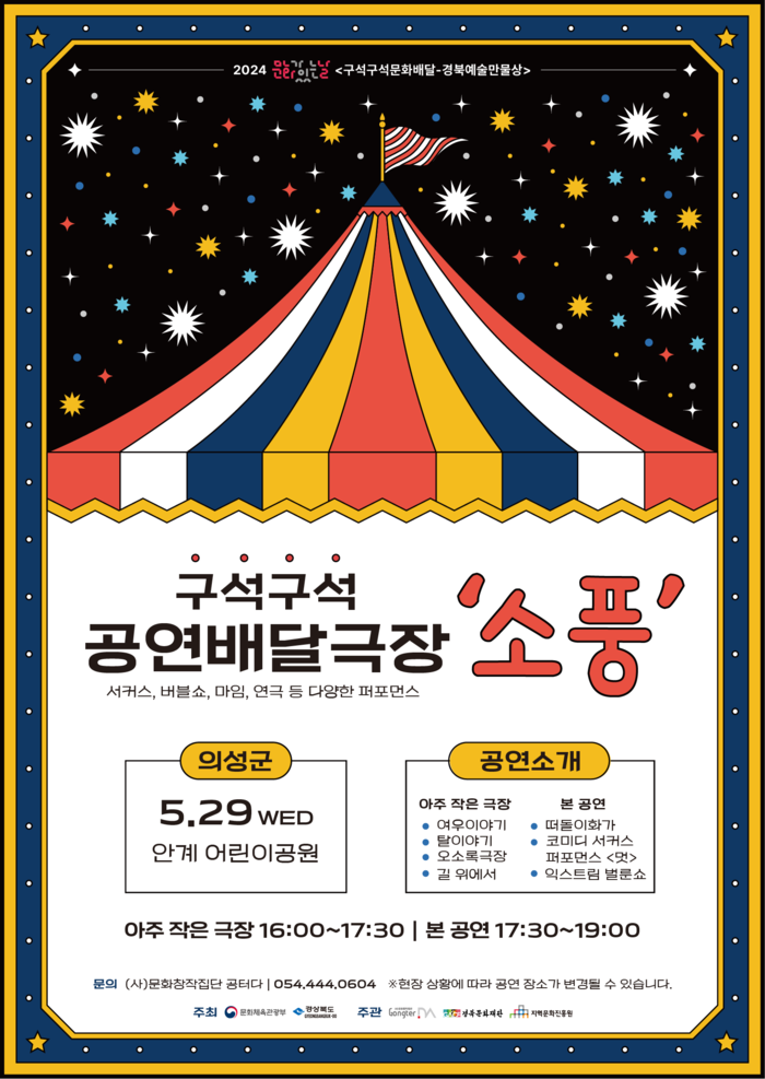 첫 번째 공연은 오는 29일 의성군 안계 어린이공원에서 진행되며, 본 공연 세 작품(떠돌이 화가, 코미디 서커스 퍼포먼스‘멋’, 익스트림 벌룬)과 아주작은극장 네 작품(여우이야기, 작은광대우주극장 탈이야기, 오소록극장, 길 위에서)이 오후 4시부터 오후 7시까지 다채롭게 펼쳐진다.