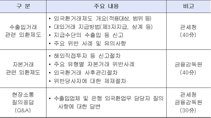 참석대상자는 수출입기업과 외국환업무 취급기관 등의 직원으로 사전 등록 절차 없이 누구나 참석할 수 있다. 일정은 ▲3일 서울 금융감독원 ▲4일 인천본부세관 ▲5일 정부광주지방 합동청사 ▲6일 정부대구지방