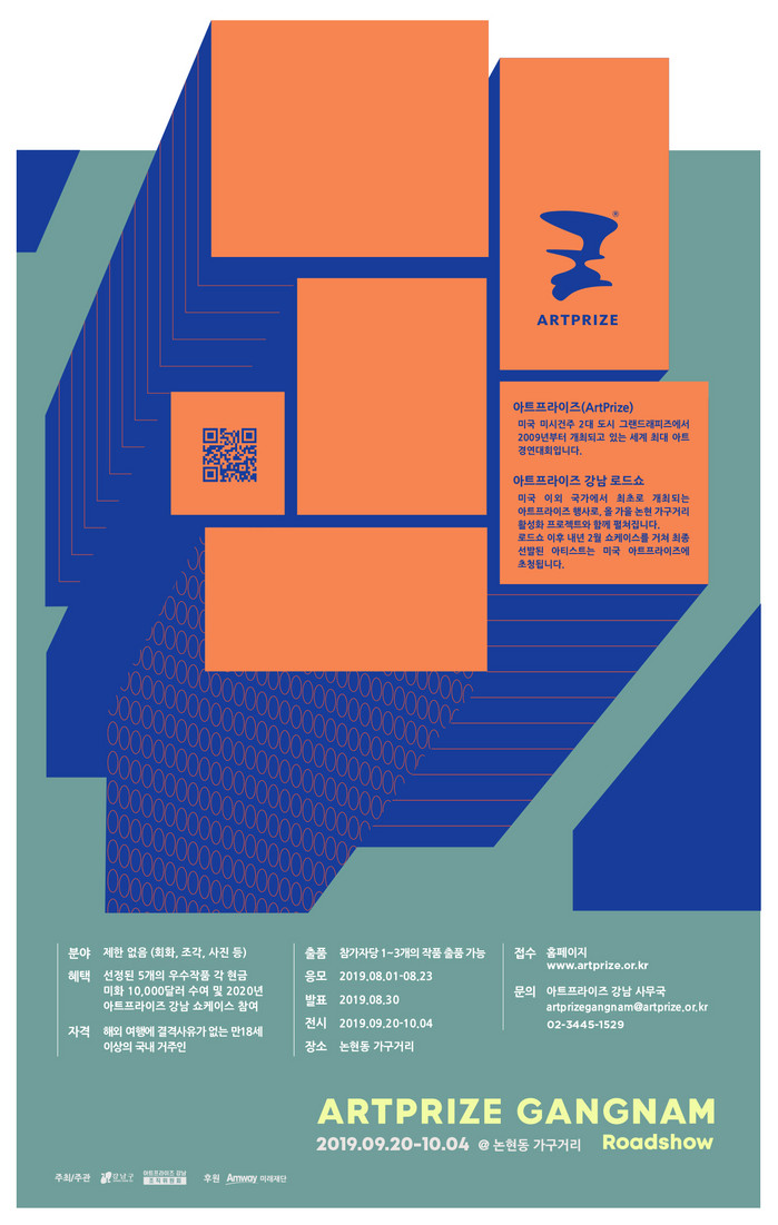 먼저 진행되는 ‘아트프라이즈 강남 로드쇼’는 15일 공모 공지를 시작으로 오는 8월 1일부터 23일까지 참가자들의 서류 접수를 받는다. 국내에 거주하는 만 18세 이상의 아티스트라면 누구나 지원할 수 있다. 이후 8월 30일 전시 작품 발표에 이어 9월 20일부터 10월 4일까지 강남구 논현동 가구거리에서 전시를 진행한다.
