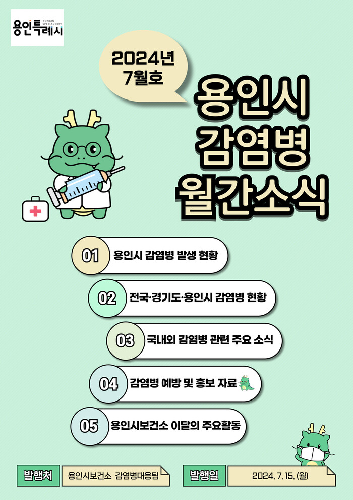 감염병 소식지는 ▲용인시 감염병 발생 현황 ▲전국·경기·용인 감염병 현황 ▲국내외 감염병 소식 ▲감염병 예방 홍보 자료 ▲용인특례시 보건소 이달의 주요 활동 등의 내용을 한눈에 알아보기 쉽게 담았다.