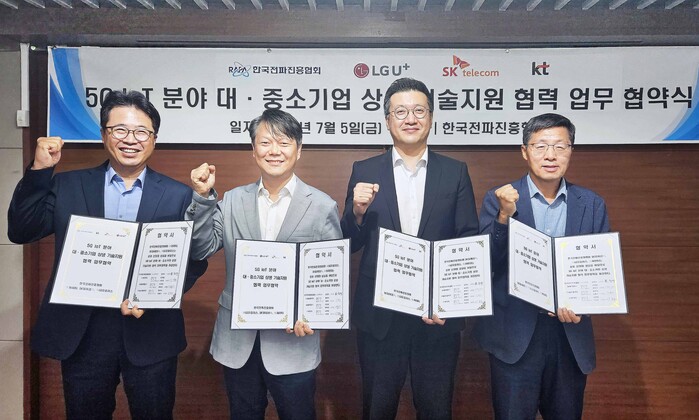 LG유플러스(대표 황현식)를 비롯한 통신 3사와 한국전파진흥협회(협회장 황현식, 이하 RAPA)가 통신 관련 제품을 개발하는 중소기업의 기술 육성을 위해 업무협약을 체결했다.