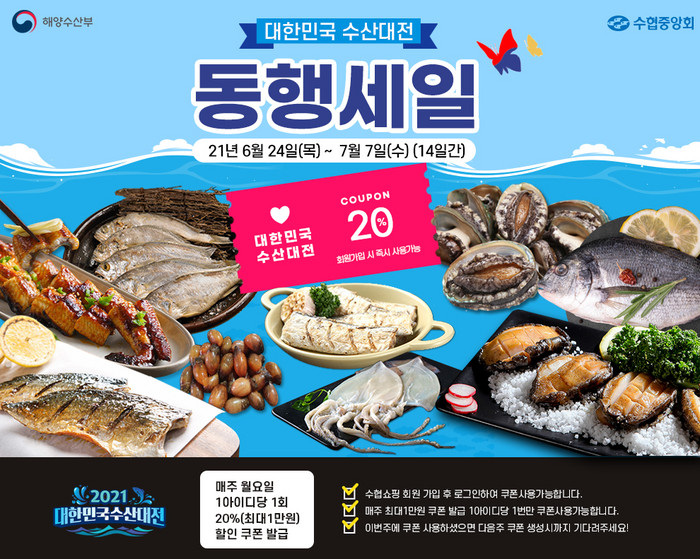 수협중앙회 직영 온라인 수산물 전문 쇼핑몰 수협쇼핑은 코로나19 백신접종을 장려하는 취지에서 다음달 7일까지 백신접종을 완료한 고객들을 대상으로 2만원 이상 구매시 사용할 수 있는 5000원 ‘보신(補身) 할인쿠폰’을 1000명에게 증정한다.