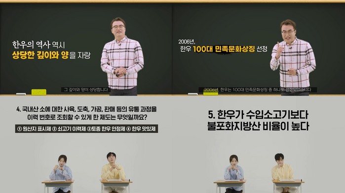 | ▲한우자조금 유튜브 콘텐츠 (위: 대한민국의 자랑, 우리 한우의 역사 / 아래: 한우에 대해 얼마나 알고있니? 한우 탐구영역 시험!) |