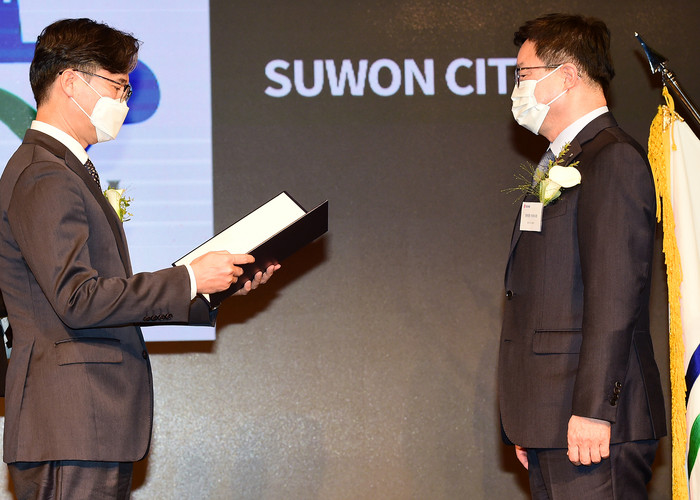 ▲염태영 시장(오른쪽)이 수상하고 있다.(수원시 제공) |