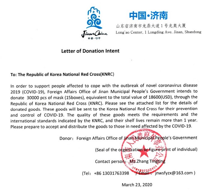 중국 지난시(1993년 자매결연)도 “수원시에 수술용 마스크 3만 매를 제공하겠다”고 의사를 밝히며 대한적십자사에 협조를 구하기 위해 보낼 기부의향서를 23일 수원시에 전달했다.