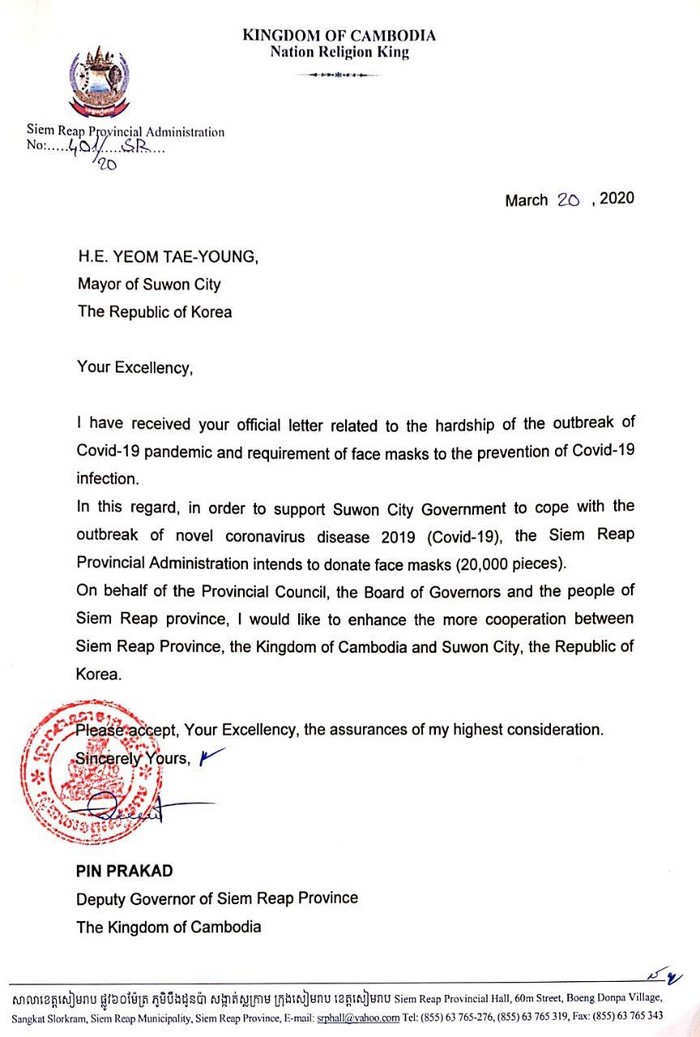 국제자매도시(2004년 자매결연)인 캄보디아 시엠립주 핀 프락(Pin Prakad) 부지사는 지난 20일 자로 염태영 수원시장에게 공식서한을 보내 “수원시의 코로나19 대응에 도움이 되도록 (수술용) 마스크 2만 매를 기부할 의향이 있다”며 “시엠립주와 수원시의 협력이 강화되길 바란다”고 말했다.