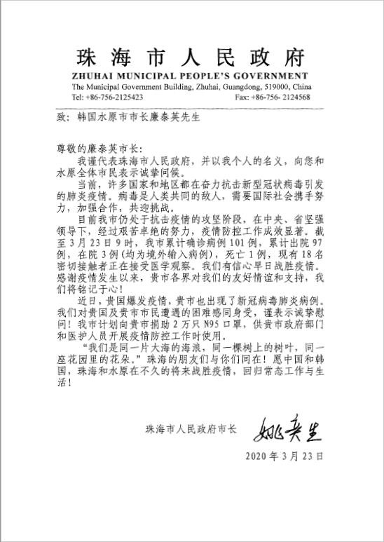 또 중국 주하이시(2006년 우호결연) 야오이성(姚奕生) 시장은 3월 23일 자로 염태영 시장에게 서한을 보내 “수원시가 겪고 있는 어려움에 동병상련의 감정을 느낀다”며 “위로의 마음을 전하고자 N95 마스크(먼지 여과율 95% 이상) 2만 매를 수원시에 전달할 계획”이라고 밝혔다. 이어 “공무원과 의료진들이 사용하시길 바란다”고 덧붙였다.