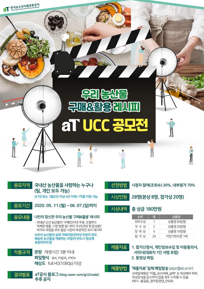 제출된 UCC 영상은 aT 유튜브 채널을 통해 공개되며 조회수, 독창성 등을 고려하여 본상 8명, 참가상 20명 등 총 28명을 시상할 예정이다.