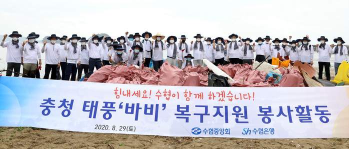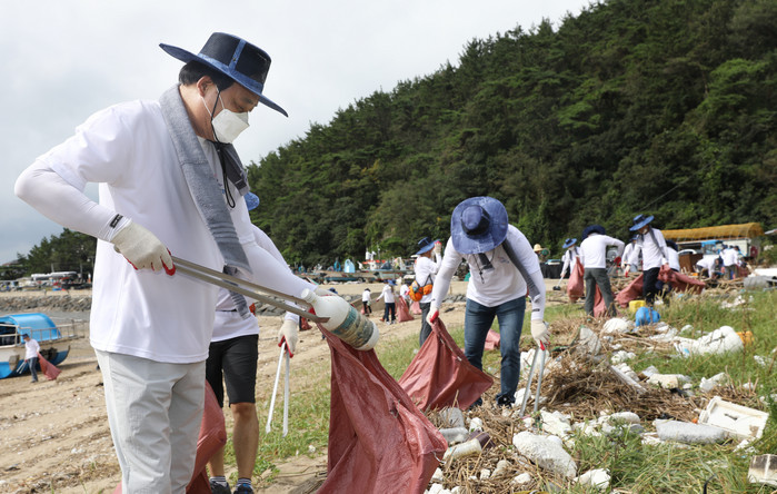 | ▲지난달 29일 임준택 수협중앙회장을 비롯한 수협 임직원들이 충남 서천에 위치한 '월하성어촌계'를 방문해 제8호 태풍 '바비'로 인해 유입된 해양쓰레기 수거 봉사활동에 나섰다 |