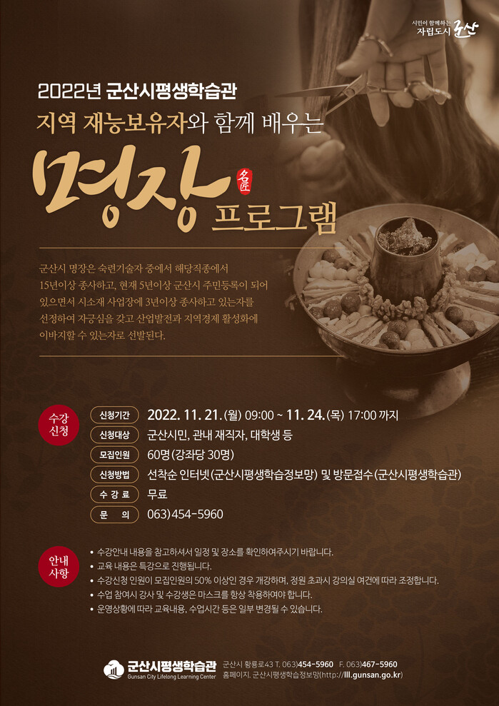 김종필 교육지원과장은 “지역 재능보유자(명장)들의 후진양성과 현장에서 뛰어난 역량을 시민들과 함께 나눔을 실천하며 기능인이 우대받고 존중받는 밑거름이 되길 기대한다.”고 말했다.