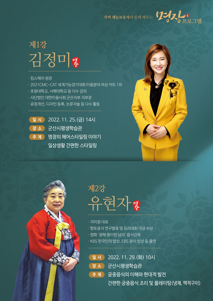 명장 프로그램은 오는 25일 '제1강 명장의 헤어스타일링 이야기(김정미 명장)', 29일 '제2강 궁중음식의 이해와 현대적 발전(유현자 명장)'의 내용으로 진행된다.