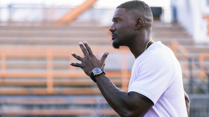 시계 다이얼의 12시와 2시 마커 사이에 1/10초로 분할된 눈금은 저스틴이 육상 100m 단거리 종목에서 세운 9.74초 기록을 의미한다. 스크류 케이스백이 적용된 시계 뒷면에는 그의 이니셜인 'JG'가 블루 에나멜로 장식되어 있고, 이 두 철자의 가운데에는 저스틴의 실제 트랙수트 한 조각이 삽입되어 특별함을 더한다.