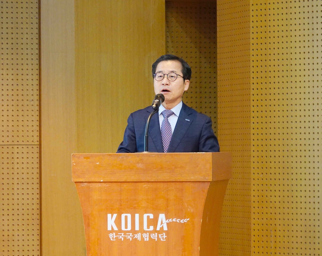 지난 30일 오후 경기도 성남시 코이카 본부에서 열린 ISO 14001 인증서 수여식에서 김동호 코이카 경영전략본부 이사가 인사말을 하고 있다.