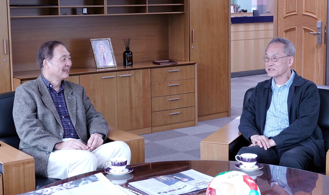 지난 30일 오후 경기도 성남시 코이카 본부에서 장원삼 코이카 이사장과 최재천 교수가 환경경영과 생태적 전환을 주제로 이야기하고 있다.