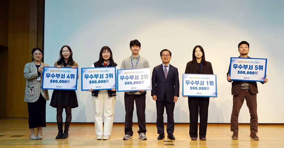 코이카 사내 임직원 참여형 캠페인 ’바이바이 CO2 챌린지에서 수상한 우수부서 직원들과 김동호 코이카 경영전략본부 이사(오른쪽 세 번째)가 기념 촬영을 하고 있다.