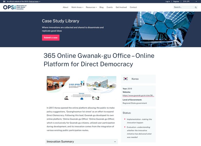 한편, 관악구의 ‘온라인 관악청(聽)’ 외에도 선정된 우수 혁신사례를 OECD 공공혁신협의체 공식 홈페이지(http://oecd-opsi.org/innovations)에서 확인할 수 있다.