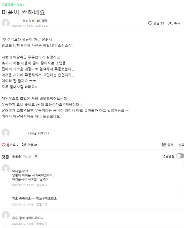 지난해 12월, 동탄맘카페의 한 회원은 게시글을 통해 “딸이 좋아하는 초밥을 집 근처 매장에서 주문했는데, 음식과 함께 ‘어려운 시기에 주문해줘서 감사하다’는 내용의 손편지가 들어있었다”며 “모두 함께 힘내자”는 응원의 마음을 전했다. 이 게시글을 읽은 회원들은 “어려운 시기 함께 돕자, 매장 정보를 알려달라”는 등 훈훈한 분위기에 동참하기도 했다.
