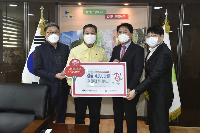 [로컬세계 박세환 기자]대구 남구는 지난 12일, ㈜영무토건(대표이사 박헌택) 및 협력사에서 코로나19로 인한 피해극복과 확산방지를 위해 성금 4000만원을 전달했다고 16일 밝혔다.