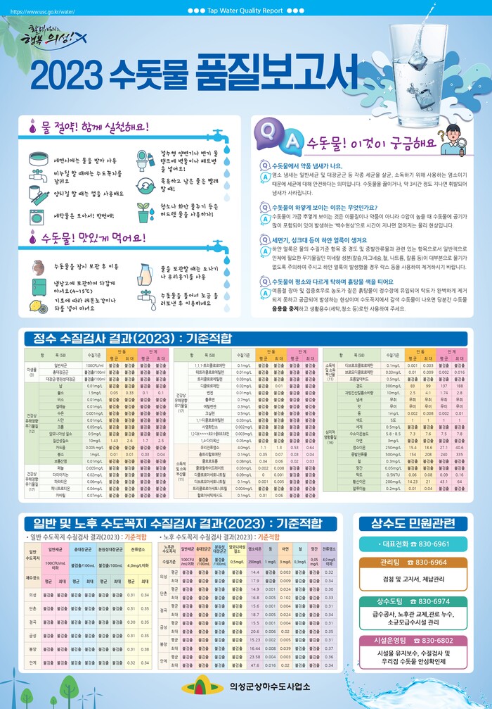 품질보고서는 책자 및 포스트 형태로 제작하였으며 포스트는 보고서의 주요 내용을 요약하여 쉽게 볼 수 있게 마을회관과 경로당에 게재할 예정이다. 자세한 수질검사 결과는 의성군 상하수도사업소 홈페이지를 통해 확인할 수 있다.