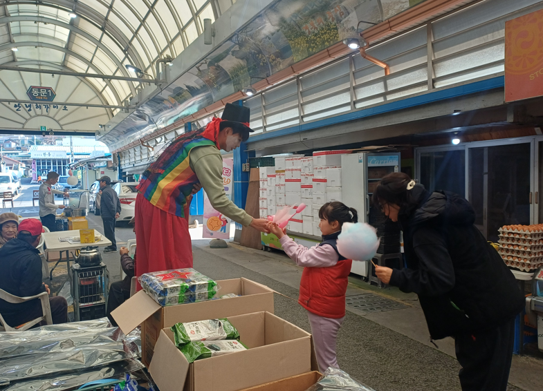 군은 전통시장에 활기를 불어넣기 위해 풍선 나눔 키다리 삐에로, 인형 복화술 거리공연, 원산지 표시 위반자 압송 퍼포먼스 등 다채로운 볼거리를 선보였다.