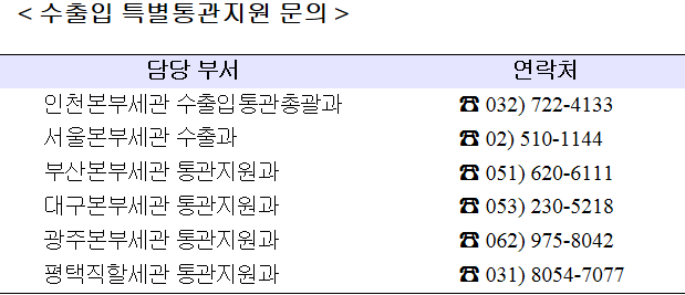일본 수출규제조치로 인한 피해예방을 위해 규제대상 물품 수입시 신속하게 처리될 수 있도록 24시간 상시 통관지원 체제를 가동하고, 서류제출 및 검사선별 최소화, 감면대상 사전심사 등 수입통관 절차를 대폭 간소화하고 있다.