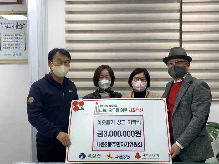 [로컬세계 = 양해수 기자]전북 군산시 나운3동은 20일 주민자치위원회(위원장 전성수)가 연말을 맞아 소외되고 어려운 이웃을 위해 이웃돕기 성금 300만 원을 기탁했다고 밝혔다.
