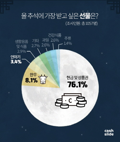 NBT 모바일 잠금화면 앱 캐시슬라이드가 20~40대 성인남녀 1057명을 대상으로 추석 관련 설문조사를 실시한 결과, 올 추석에 가장 받고 싶은 선물로 ‘현금 및 상품권’이 76.1%로 압도적인 1위를 차지했다.