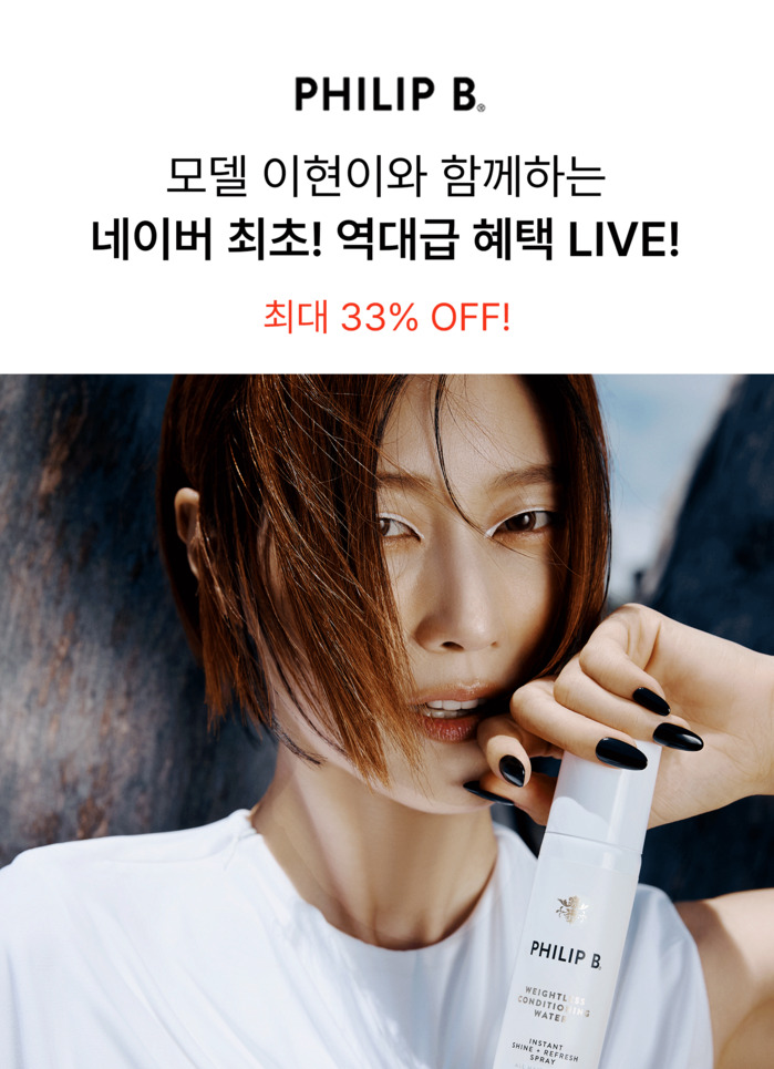 필립비는 이현이와 함께하는 네이버 쇼핑 라이브를 기념해 역대급 혜택을 준비했다. 브랜드 최초로 선보이는 최대 33% 특가 구성으로 이현이의 인생샴푸로 불리우는 두피 쿨링 샴푸 ‘페퍼민트 아보카도 샴푸’, 푸석한 모발에 윤기를 더하는 수분매직샴푸 ‘포에버 샤인 샴푸와 컨디셔너’, 뿌리는 컨디셔너 ‘웨이트리스 컨디셔닝 워터’등 다채로운 구성을 선보여 눈길을 사로잡았다.