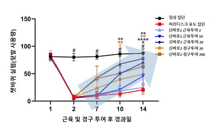 먼저 연구팀은 허리디스크 상태를 유도하기 위해 쥐 꼬리의 디스크에서 분리한 자가수핵을 쥐의 요추 5번 신경근과 가까운 부위에 이식했다. 이어 쥐 그룹을 ▲정상 집단 ▲허리디스크 유도 집단 ▲신바로2 근육투여 집단(2, 10, 20mg/kg) ▲신바로2 구강투여 집단(20, 200mg/kg) 등으로 나눠 실험을 진행했다.