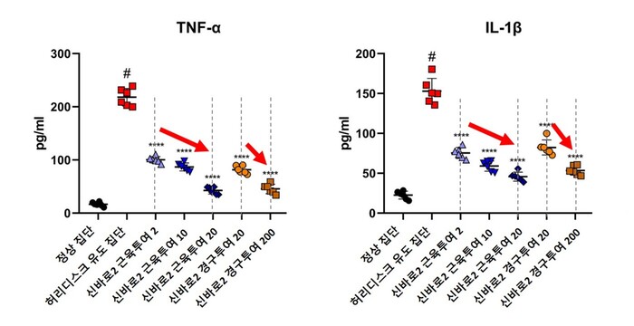 실험 결과 허리디스크 유도 후 증가했던 TNF-α와 IL-1β는 신바로2 투여에 의해 발현량이 유의미하게 감소했다. 근육투여 집단과 경구투여 집단 모두 신바로2의 농도가 높아질수록 발현량이 더욱 줄어드는 양상을 보였다. 연구팀은 산화 스트레스를 감소시킴으로써 허리 통증의 원인인 염증을 해소하는 신바로2 의 치료기전이 입증된 것이라고 해석했다.