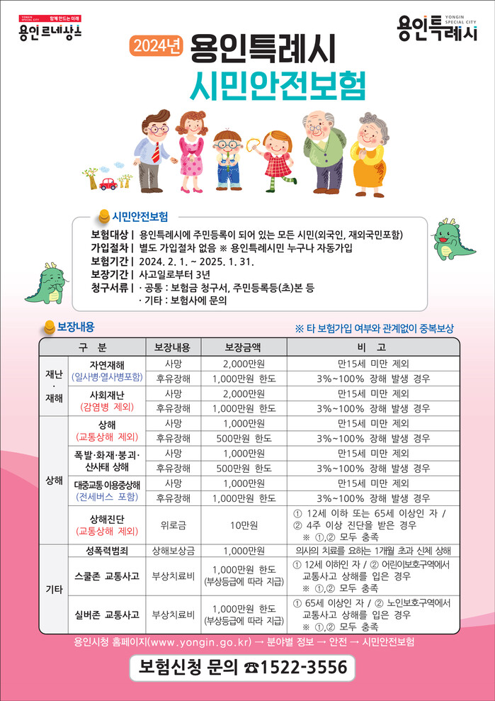 자세한 보장항목과 요건 등은 용인시청 홈페이지에서 ‘시민안전보험’으로 검색하거나 시민안전보험 통합콜센터(1522-3556)에서도 상세하게 안내받을 수 있다. 시민안전보험은 시민들이 개인적으로 가입한 타 보험이나 정부가 지급하는 재난지원금 등과 무관하게 보상금을 지원한다.