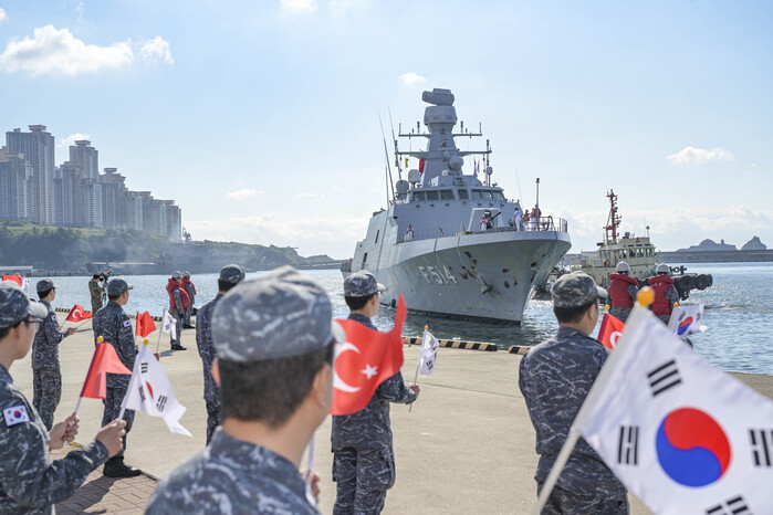 ▲튀르키예 해군 크날르아다함(Kinaliada, F-514) 이 대한민국 해군과의 우호증진 및 군사협력 강화를 위해 4일 부산작전기지를 방문했다.(부산작전사 제공) |
