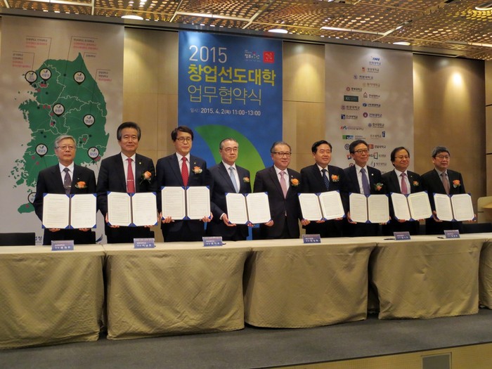▲지난 2일 국민대학교에서 열린 ‘2015년 창업선도대학 육성사업’ 업무협약식에서 각 대학 총장들이 협약서를 들고 기념촬영을 하고 있다. |