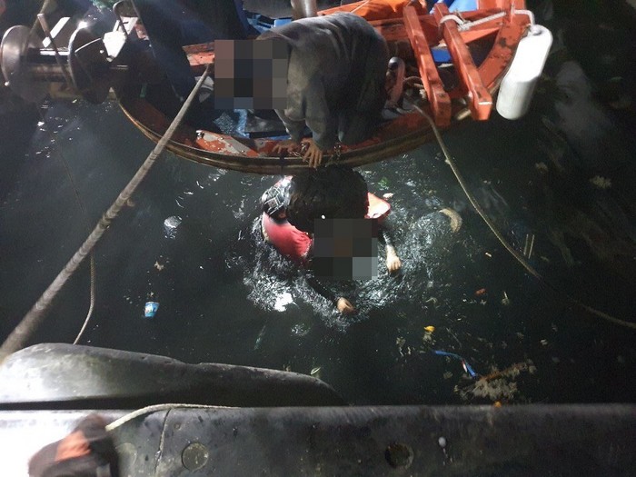 ▲14일 새벽 2시경 다대 아귀 위판장 앞 해상에 익수자 2명 신고 받아 긴급 출동해 구조하는 모습.(부산 해양경찰서 제공) |