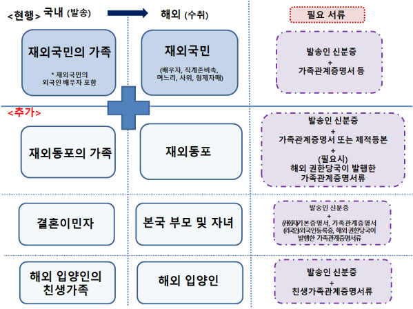 관세청는 관계부처 협의를 거쳐 외국 국적을 가진 재외동포(해외 입양인 포함) 및 결혼이민자의 부모·자녀에 대해서도 발송을 허용하기로 결정했다고 24일 밝혔다.