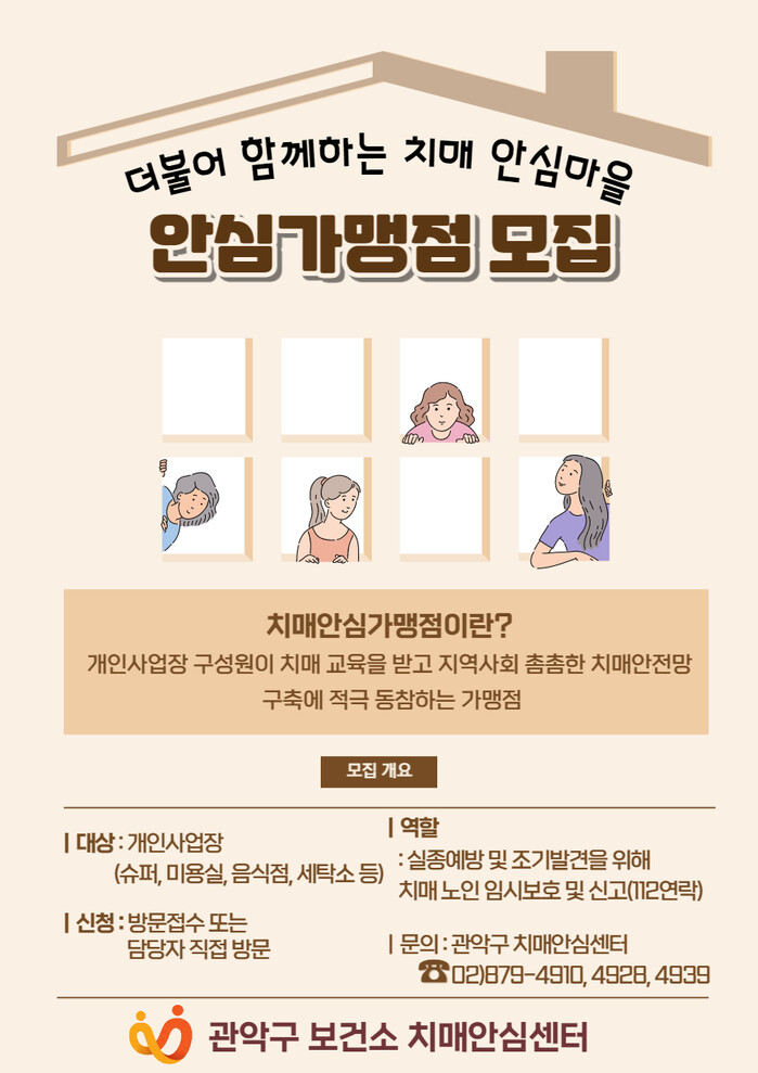 치매안심가맹점 신청은 사업자등록번호 가운데 숫자가 01~79, 90~99인 개인사업자 누구나 가능하며, 자세한 사항은 관악구보건소 치매안심센터로 문의하면 된다.