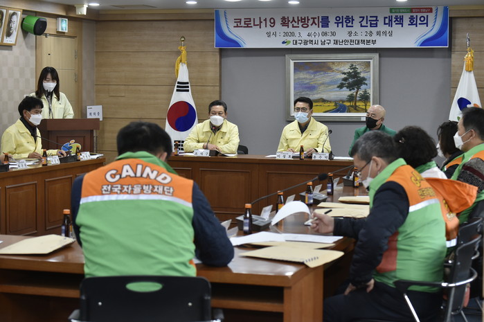 [로컬세계 박세환 기자]대구 남구청은 5일 조재구 남구청장 주재 긴급회의를 개최해 코로나19로 인한 피해를 최소화하고 주민들의 건강을 보호하고자 지역자율방재단을 동원한 합동방역을 실시하기로 했다.